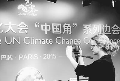 氣候變化巴黎大會(huì)期間,各國(guó)媒體紛紛聚焦中國(guó)角系列活動(dòng)。圖為一名記者在中國(guó)角活動(dòng)現(xiàn)場(chǎng)拍攝。