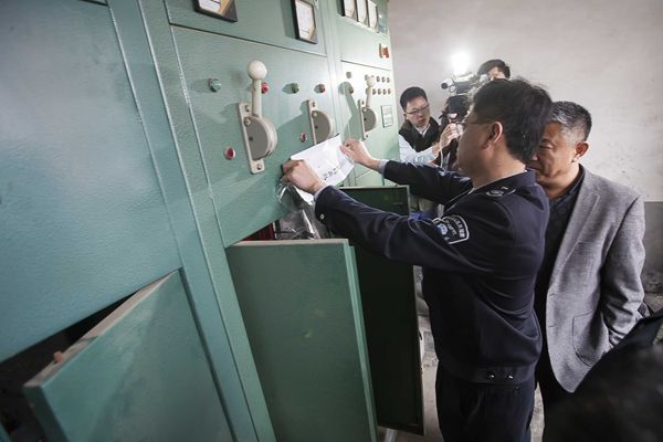 ??? 貼完封條,環(huán)保部門決定對企業(yè)拉閘斷電。“對違法企業(yè)來說,斷了電,不關(guān)停也得關(guān)停?!惫╇姽菊业狡髽I(yè)的配電室,將車間對應(yīng)的電閘拉下,并由環(huán)保執(zhí)法人員貼上封條。